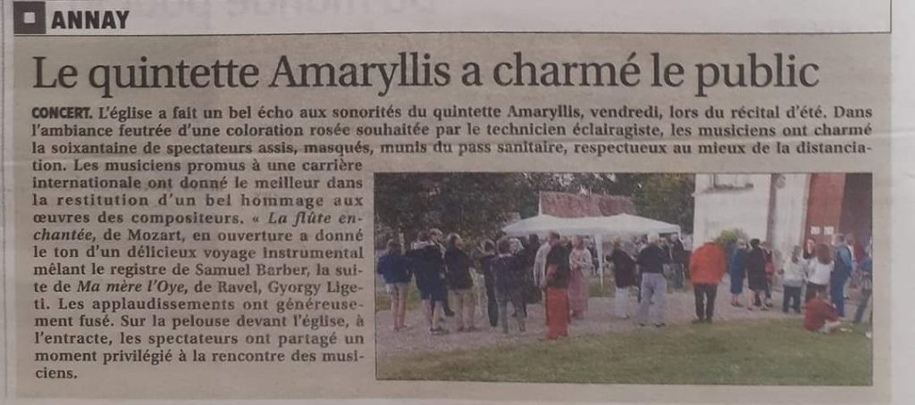 Le Quintette AMARYLLIS s’est produit en l’église d’Annay le 30 juillet dernier. Un concert de musique de chambre « De Mozart à Ravel ». Grand succès pour cette représentation.